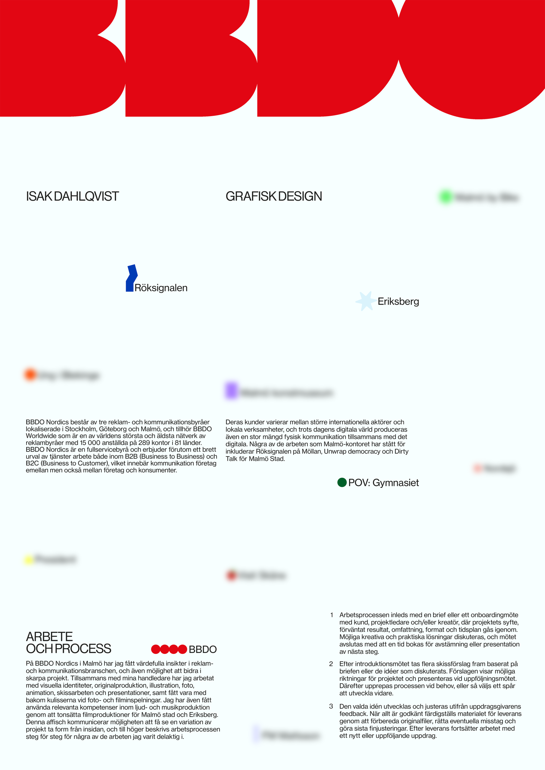 BBDO Nordics tillhör ett av världens största nätverk av reklam- och kommunikationsbyråer, men trots detta har hösten på Malmö-kontoret känts väldigt lokal. Många av de projekt jag haft möjlighet att få en inblick i eller bidra till har haft en stark koppling till Malmö, men med kontor i Göteborg och Stockholm har jag även fått samarbeta med andra BBDO-kollegor. Som fullservicebyrå erbjuder BBDO Nordics ett helhetspaket, men tillsammans med studion har större delen av mina arbetsuppgifter handlat om originalproduktion. Det har varit layout, animering och illustration, men även skapande av grafisk profil, foto- och filminspelningar och en del ljudproduktion.