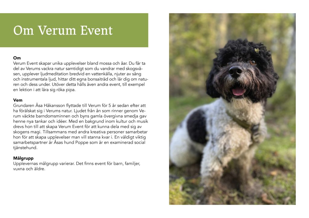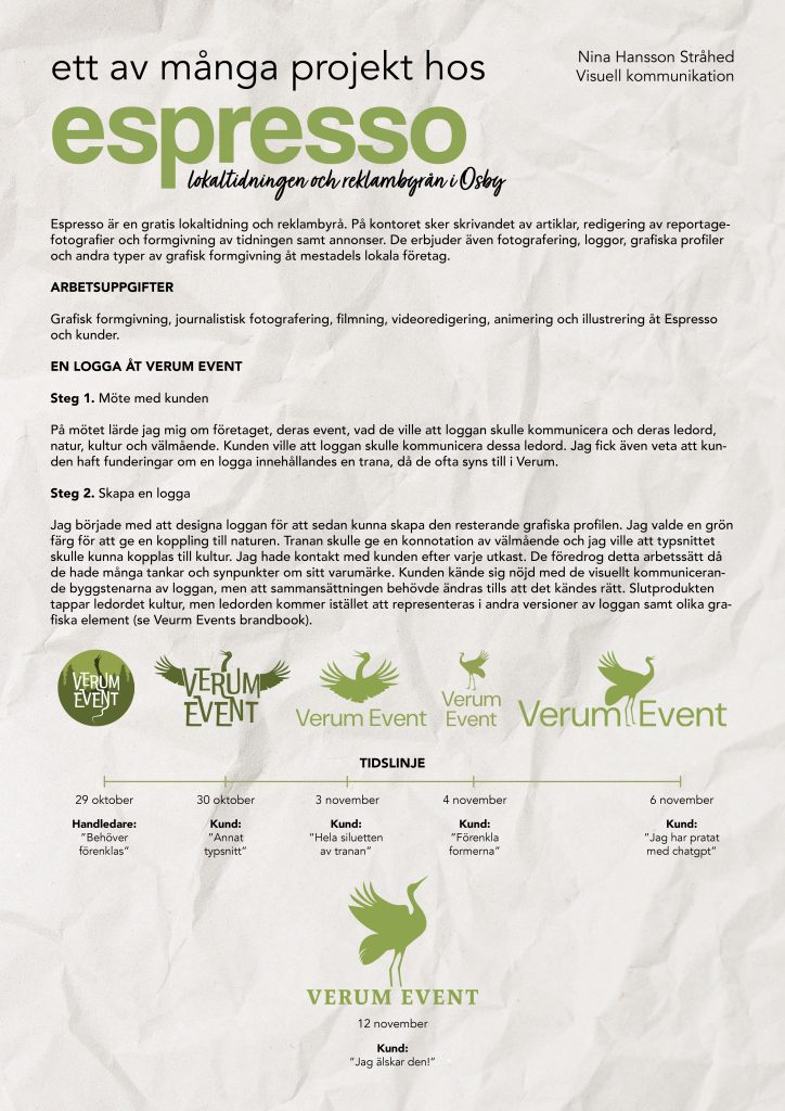 Mitt namn är Nina Hansson Stråhed och jag studerar Visuell kommunikation. Jag hade min praktik på reklambyrån och lokaltidningen Espresso där jag hade arbetsuppgifter inom grafisk formgivning, fotografering, videoredigering och illustrering. Här är min poster som beskriver processen av att göra Verum Events logga. Jag har även lagt till brandbooken jag gjorde för Veurm Events grafiska profil.