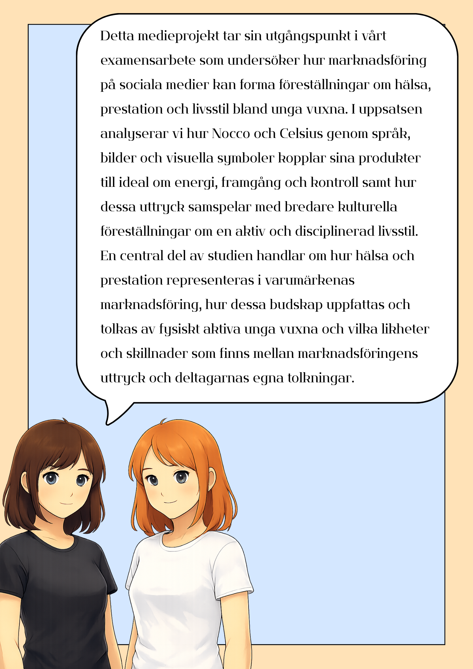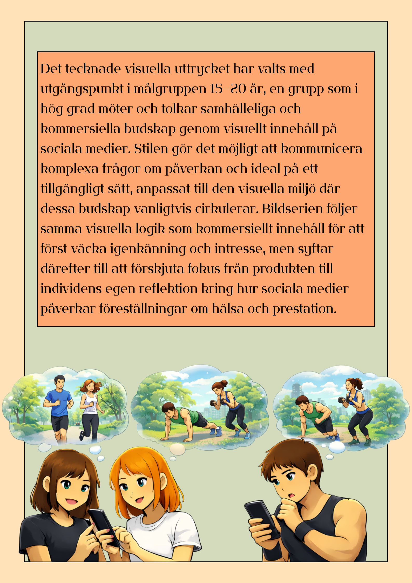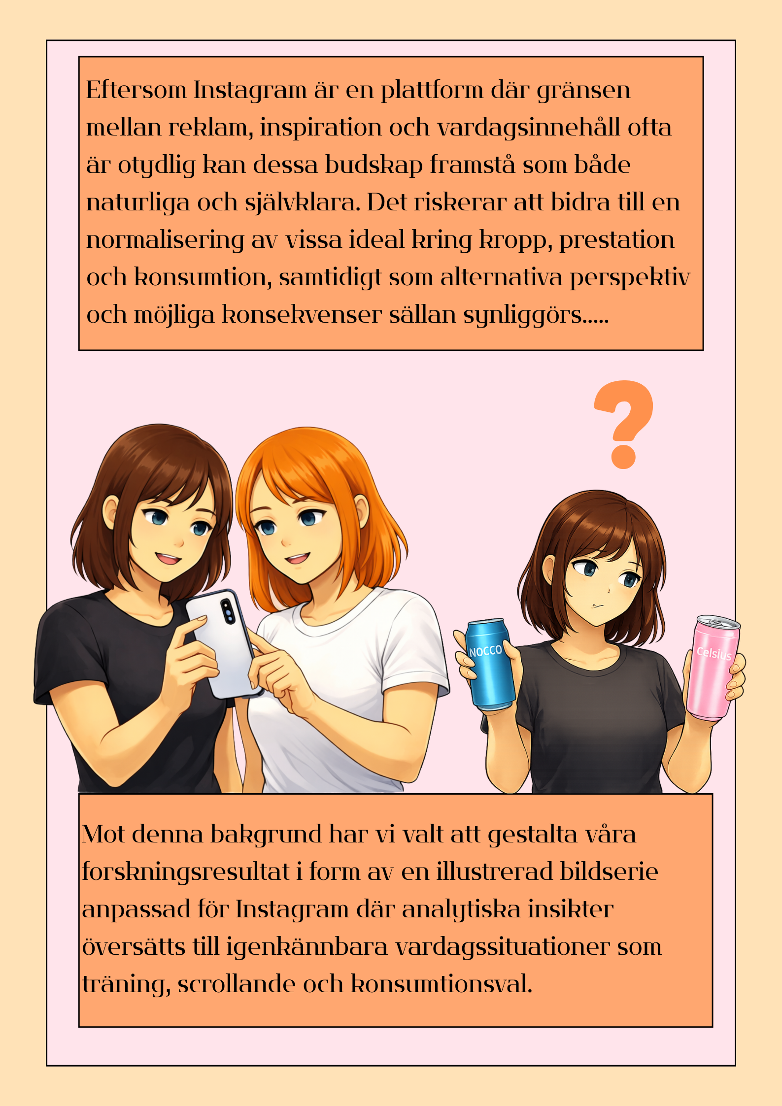Vårt examensarbete undersöker hur varumärkena Nocco och Celsius representerar hälsa, prestation och livsstil i sin marknadsföring, samt hur fysiskt aktiva unga vuxna i åldrarna 23–28 år uppfattar och tolkar dessa framställningar. Målet med gestaltningen var att skapa en bildserie i form av ett Instagraminlägg där en samling bilder synliggör hur varumärkesbudskap både känns igen, ifrågasätts och förhandlas i vardagliga situationer som träning, scrollande och konsumtionsval. Gestaltningen bygger på insikter från studiens två metodiska angreppssätt, en semiotisk analys och en fokusgruppsintervju. Den semiotiska analysen användes för att synliggöra hur Nocco och Celsius genom språk, bilder, färger och symboler kommunicerar föreställningar om energi, motivation och en aktiv livsstil. Fokusgruppsintervjun bidrog med förståelse för hur dessa uttryck tolkas av mottagare och hur varumärkesbudskap kan accepteras, omförhandlas eller ifrågasättas i relation till egna erfarenheter och vardagspraktiker. Bildserien gestaltar därmed både varumärkens sätt att kommunicera och mottagarnas tolkningsprocesser. Serien riktar sig till målgruppen 15–25 år och är medvetet enkelt uppbyggd för att möjliggöra snabb tolkning och bibehållet fokus. Valet av stil är baserat på dess popularitet bland unga och dess starka närvaro i digitala miljöer.